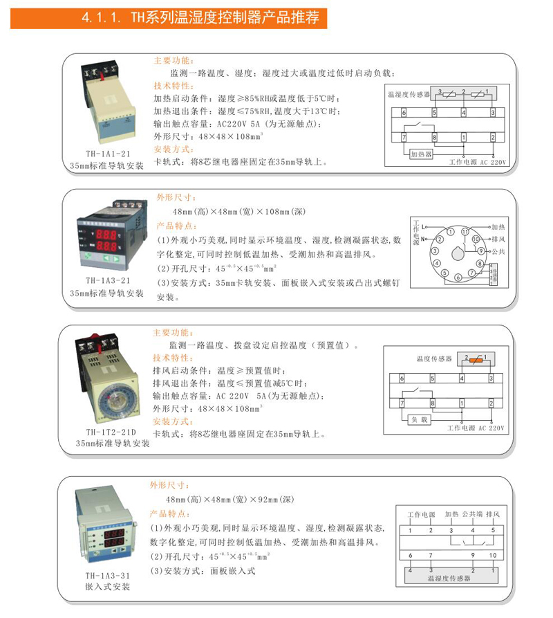 TH系列溫濕度控制器產(chǎn)品主要用于中高壓開關(guān)柜、端子箱、環(huán)網(wǎng)柜、箱變等設(shè)備內(nèi)部溫度和濕度的調(diào)節(jié)控制。可有效防止因低溫、高濕造成的設(shè)備故障以及受潮或結(jié)露引起的爬電、閃絡(luò)事故的發(fā)生。產(chǎn)品分為普通系列和智能型數(shù)顯系列。普通型溫濕度控制器采用進(jìn)口高可靠溫濕度傳感器,結(jié)合穩(wěn)定的模擬電路及電源技術(shù)制作而成。繼電器動(dòng)作、加熱器故障電源等工作狀態(tài)均由LED 指示,用戶一目了然,產(chǎn)品穩(wěn)定可靠, 能長期工作于強(qiáng)電磁場等惡劣環(huán)境中。智能型溫濕度控制器以數(shù)碼管方式顯示溫濕度值,有加熱器、傳感器故障指示,用戶可通過按鍵編程自行設(shè)定系統(tǒng)參數(shù)。該儀表集測量、顯示及控制于一體,精度高、測量范圍寬,是一種適合于各個(gè)行業(yè)和領(lǐng)域的溫濕度測量控制儀表。產(chǎn)品符合國標(biāo)GB/T15039-1994。