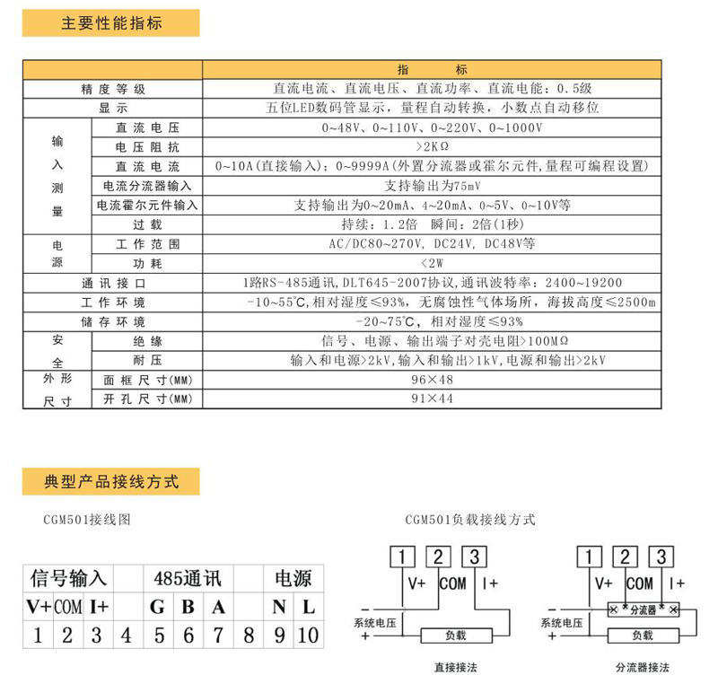 CGM501屏裝式安裝直流電能表是針對直流屏、太陽能供電、電信基站等應用場合而設計的, 該電力儀表可測量直流系統中的電壓、電流、功率、正向與反向電能。既可用于本地顯示, 又能與工控設備、計算機連接,組成測控系統。儀表可具有RS-485 通訊接口,采用 DLT 645-2007 協議, LED 顯示,采用開孔安裝。
